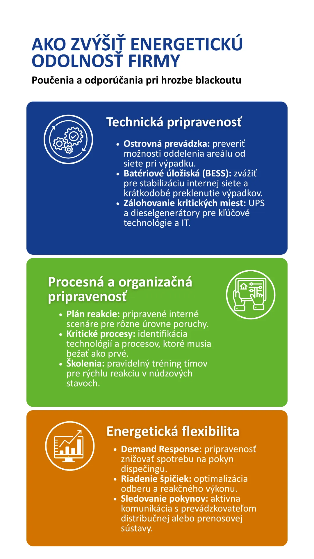 No v čase, keď rýchlo rastú podiel OZE, digitalizácia aj spotreba,blackout nemožno úplne vylúčiť.O to dôležitejšie je pripraviť sa naň technicky aj organizačne a počítať s tým, žeenergetická odolnosť podniku je súčasťou firemného rizikového manažmentu.