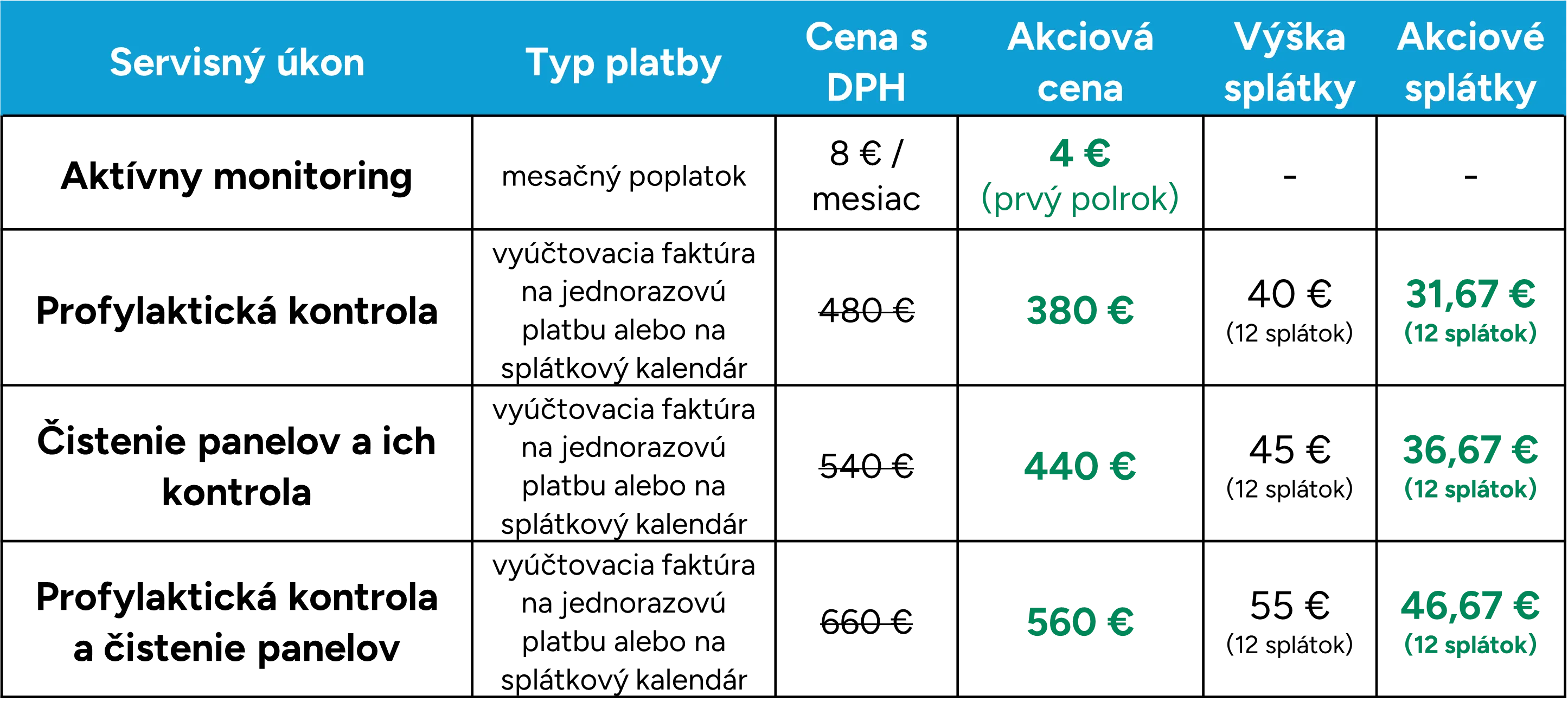 Servisné služby sú vhodné pre domácnosti aj pre firmy. Objednať si ich môžu len zákazníci s inštalovanou fotovoltikou od našej spoločnosti.V prípade aktívneho monitoringu je to fotovoltika inštalovaná od nás, ktorá disponuje systémom SolarEdge alebo systémom FusionSolar.