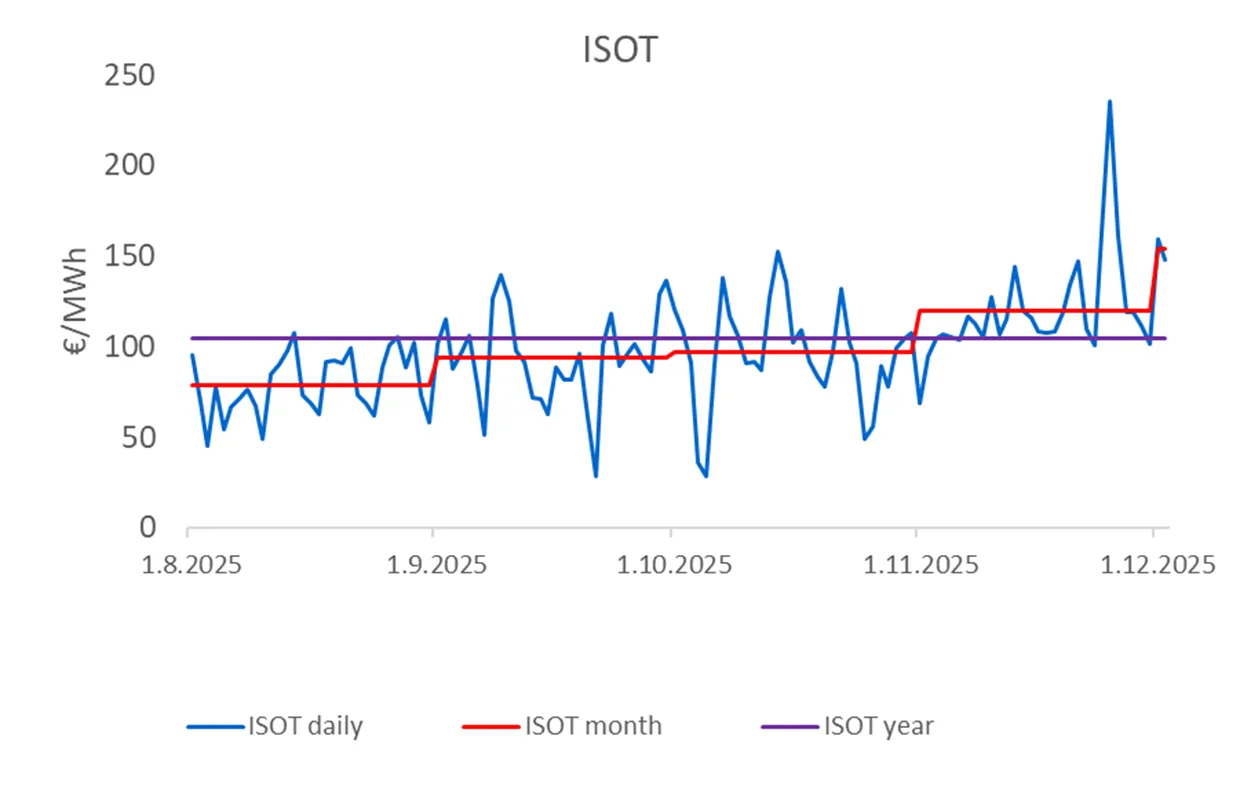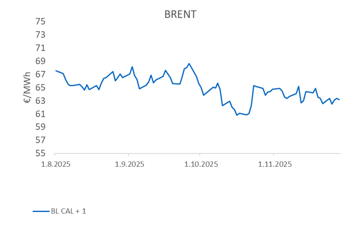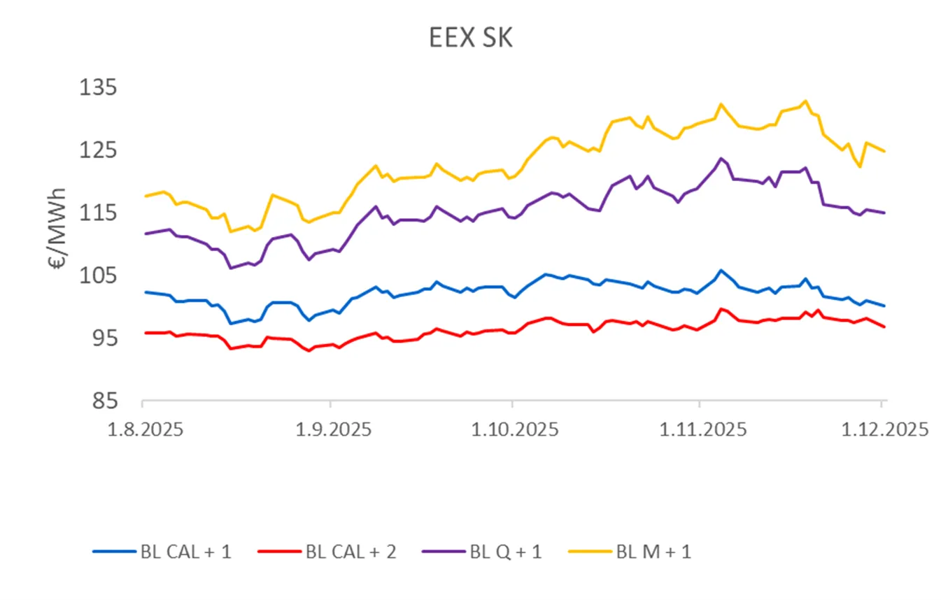 Ceny elektriny vstúpili do novembra na utlmených úrovniach z predchádzajúceho mesiaca, avšak už počas prvej dekády začali kopírovať rast celého energetického komplexu.Očakávané chladnejšie počasie a slabšia veterná produkcia zvyšovali nároky na merit order výrobných zdrojov.Nemecký kontrakt Cal26, podporený rastom cien plynu a ropy a po oznámení OPEC+, že v Q1/26 pozastaví plánované zvyšovanie produkcie, dosiahol 90,93 €/MWh, čo bola najvyššia denná cena od 23. júna. Tento vývoj sa premietal aj do regiónu vrátane slovenského trhu.