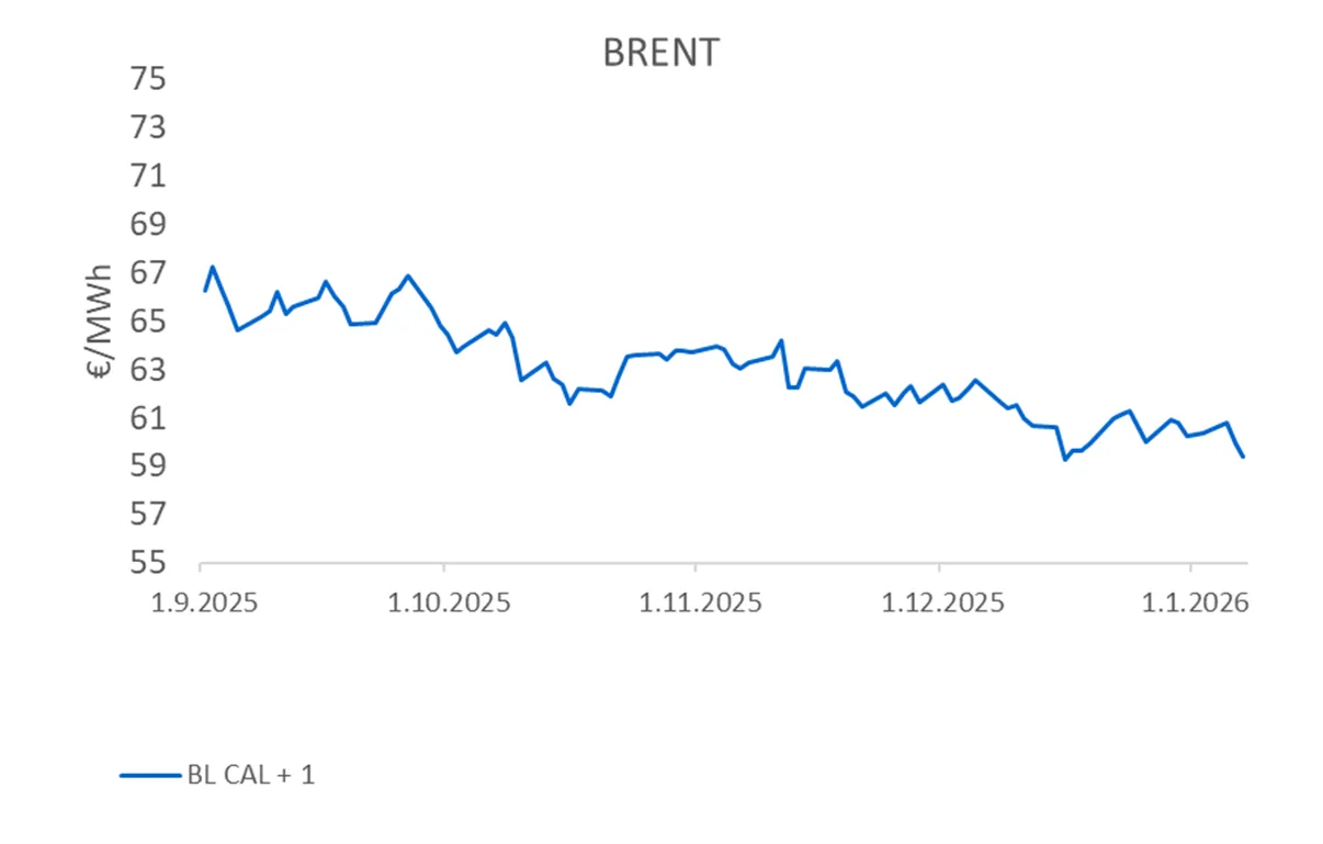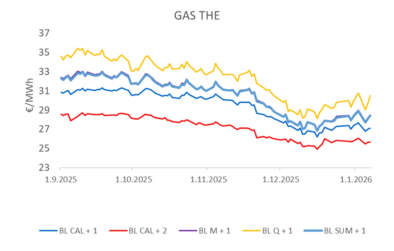 V prvej polovici decembra bol kľúčovým „ťahúňom“ smerom nadol hlavneplyn, ktorý sa pohyboval až na 20-mesačných minimách. Dôvodom boli prevažujúce mierne teplotné prognózy, stabilné nórske dodávky a silný prílev LNG, pričomtrh postupne prestával vnímať nižšie medziročné naplnenie zásobníkov ako bezprostredné riziko. Napriek tomu, že stavy v zásobníkoch boli približne o 8 – 10 percentuálnych bodov nižšie oproti priemeru posledných rokov, obchodníci boli presvedčení o dostatočnosti ponuky, čo malo vplyv hlavne na nemecké forwardy.