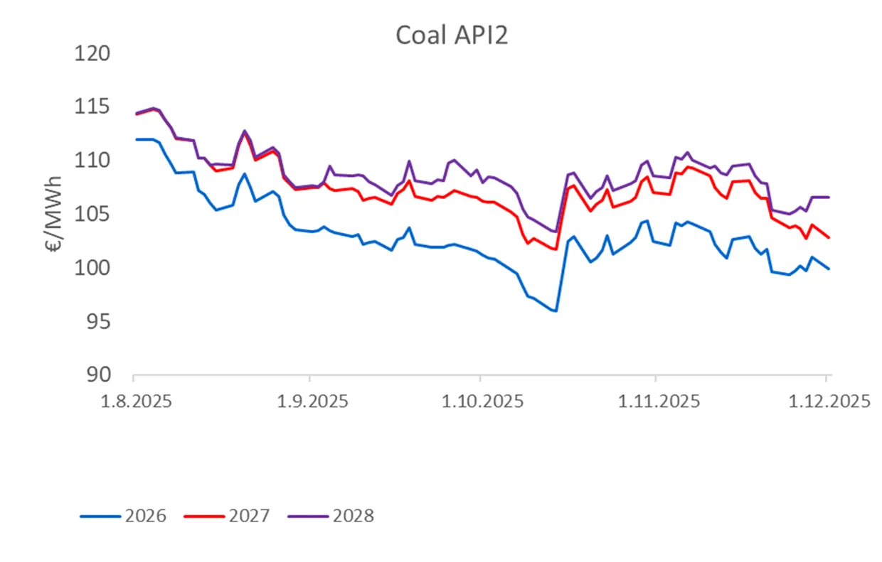 Trh s uhlím bol počas novembra zmiešaný. Začiatkom mesiaca európske ceny vyskočili nadvojmesačné maximum, no zostali v pomerne širokom pásme ±5 USD v dôsledku dostatočnej ponuky. Krátkodobý dopyt bol tlmený miernym počasím a konkurenčnými cenami plynu.