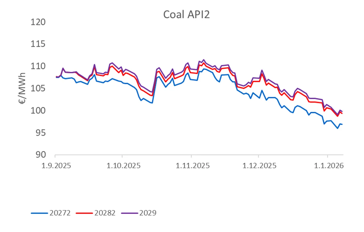 Uhlie sa v závere roka správalo odlišne. Jeho ceny boli viac naviazané napočasie, výrobu elektriny a cenu emisných povoleniek. Dôležitým faktorom bola aj interakcia s plynom: pri veľmi nízkych cenách plynu sa znižoval priestor na prechod z plynu na uhlie v energetickom mixe. Na druhej strane rast cien emisných povoleniek v druhej polovici mesiaca zvyšoval nákladovosť uhlia, no zároveň signalizoval vyššiu spotrebu fosílnych palív počas chladnejších období.