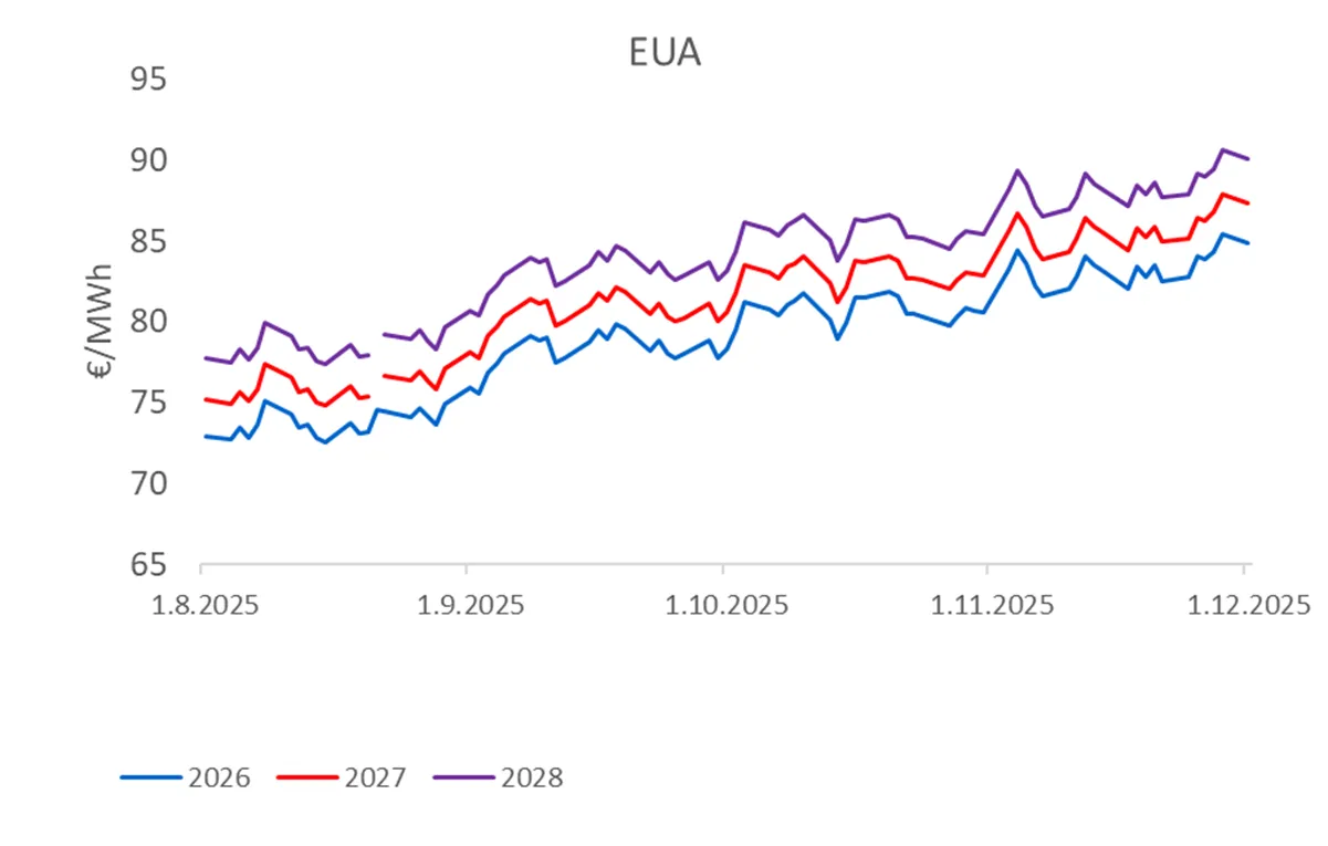 EUA- ceny na relatívne vysokých úrovniach, podporené kombináciou očakávaného sprísnenia trhu v roku 2026, silných špekulatívnych dlhých pozícií a nižšej krátkodobej ponuky z aukcií |