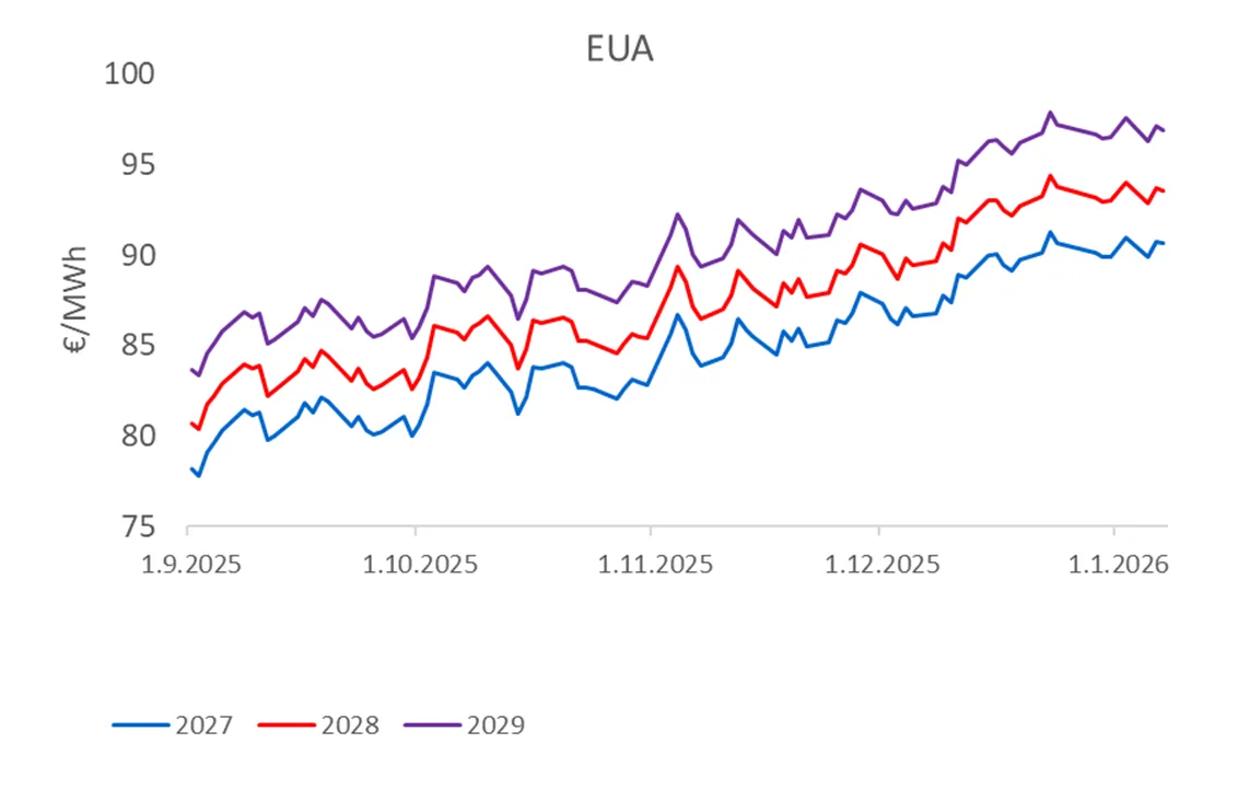 Situácia sa výrazne zmenila v druhej polovici decembra. Kľúčovým faktorom sa stalapauza v aukciách emisných povoleniek, ktorá trvala od polovice mesiaca až do začiatku januára. Zníženie primárnej ponuky na trhu výrazne sprísnilo krátkodobé fundamenty a vytvorilo priestor pre rast cien. Investičné fondy zároveň postupne navyšovali svoje čisté dlhé pozície, ktoré sa dostali na rekordné úrovne, čo posilnilo rastový sentiment. Trh bol podporený aj zvýšeným dopytom zo strany priemyslu a lodného sektora v súvislosti s prísnejším uplatňovaním ETS od roku 2026.