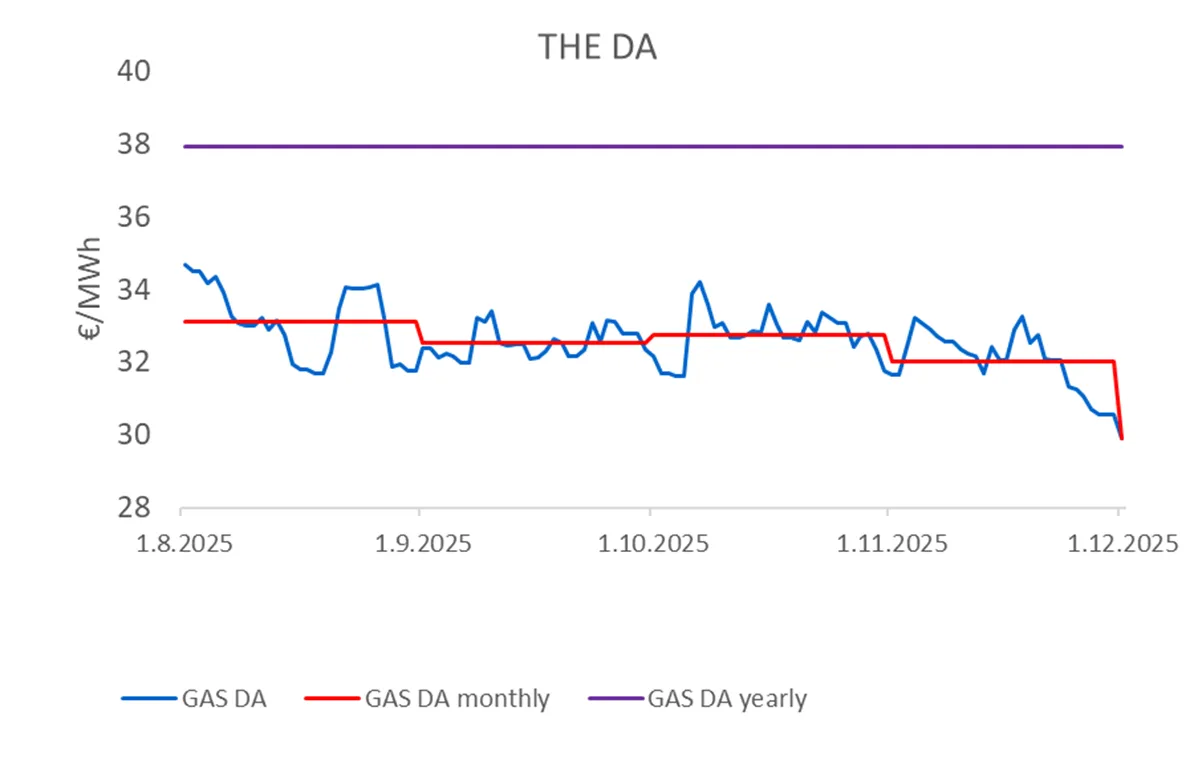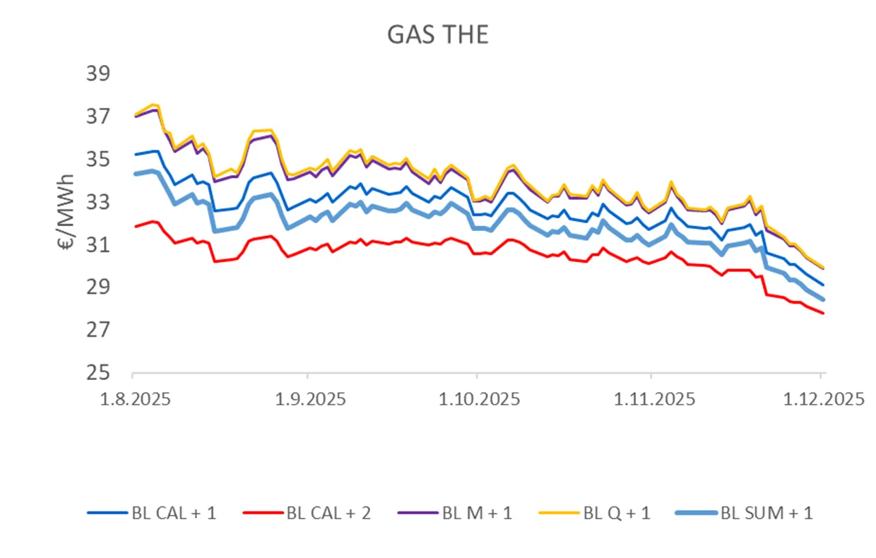 - V kombinácii s miernymi predpoveďami počasia na začiatok decembra a dobrou dostupnosťou LNG to viedlo ku koncu novembra k celkovo klesajúcemu trendu veľkoobchodných cien elektriny, hoci trh ostáva citlivý na akékoľvek prekvapenia v počasí a geopolitike.