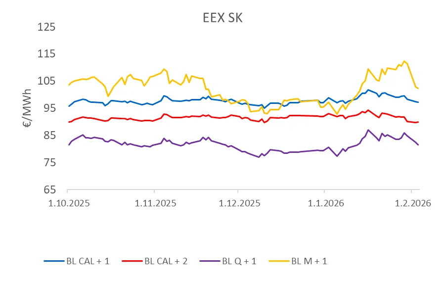 Veľmi silným impulzom bol mráz v kontinentálnej Európe – v Nemecku okolo -3,9 °C (výrazne pod normálom) a ešte výraznejšie v krajinách strednej a východnej Európy. Na spote dominovala kombinácia nízkej výroby z vetra – „dunkelflaute“, vysokého dopytu a regionálnych úzkych miest v prenosovej sústave. V juhovýchodnej Európe vznikala výrazná prémia voči západu, pričom viaceré prenosové sústavy zaznamenali rekordy vo fyzických zaťaženiach siete.Trh tak videl, že napätie nie je len o komoditách, ale aj o fyzike siete.Slovenský trh bol súčasťou tejto regionálnej prémie, keďže obmedzené cezhraničné kapacity nedokázali plne vyrovnávať rozdiely medzi západom a východom kontinentu.