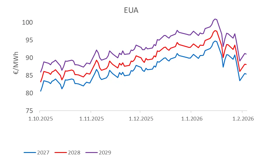 Tie sa prvýkrát po viac ako dvoch rokoch dostali v januári nad 90 EUR/t, pričom pohyb posilňovali pozície investičných fondov a očakávania prísnejších bilancií EU ETS (nižšie aukcie, CBAM, širšie pokrytie sektora). Keď sa v druhej polovici mesiaca pridali colné hrozby a nálada znášať vyššie riziko, EUA prudko korigovali a elektrina s nimi – Cal27 klesal pri masívnom vyberaní ziskov a prehodnocovaní makrovyhliadok.