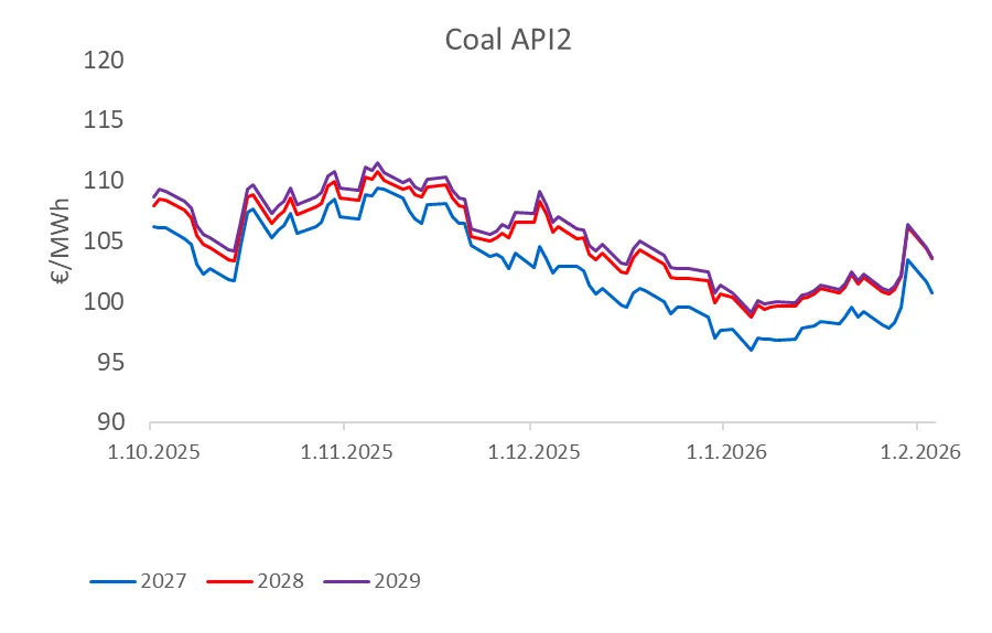 Na rozdiel od ropy, uhlie reagovalo viac na regionálne fundamenty. Ťažilo z kombinácie chladného počasia a vyššieho využitia tepelných elektrární, najmä v obdobiach, keď obnoviteľné zdroje nedokázali pokryť dopyt. Aj keď bol plyn počas nestudenších periód stále konkurencieschopný, uhlie si udržiavalo pozíciu dôležitého zdroja v energetickom mixe.