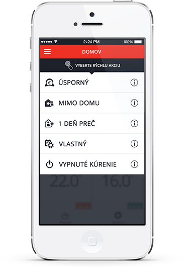 Po registrácii a po inštalácii aplikácie do smartfónu, nech už ste kdekoľvek, môžete kontrolovať časový program vášho vykurovacieho systému a jediným dotykom aktivovať niektorú z rýchlych volieb: voľný deň, neprítomnosť, eko úspora, vypnúť kúrenie. Ak sa dostanete domov neskôr, nemusíte zbytočne kúriť. Takto môžete podľa svojho životného štýlu ovládať vykurovací systém vášho domova a ušetriť energiu aj peniaze.